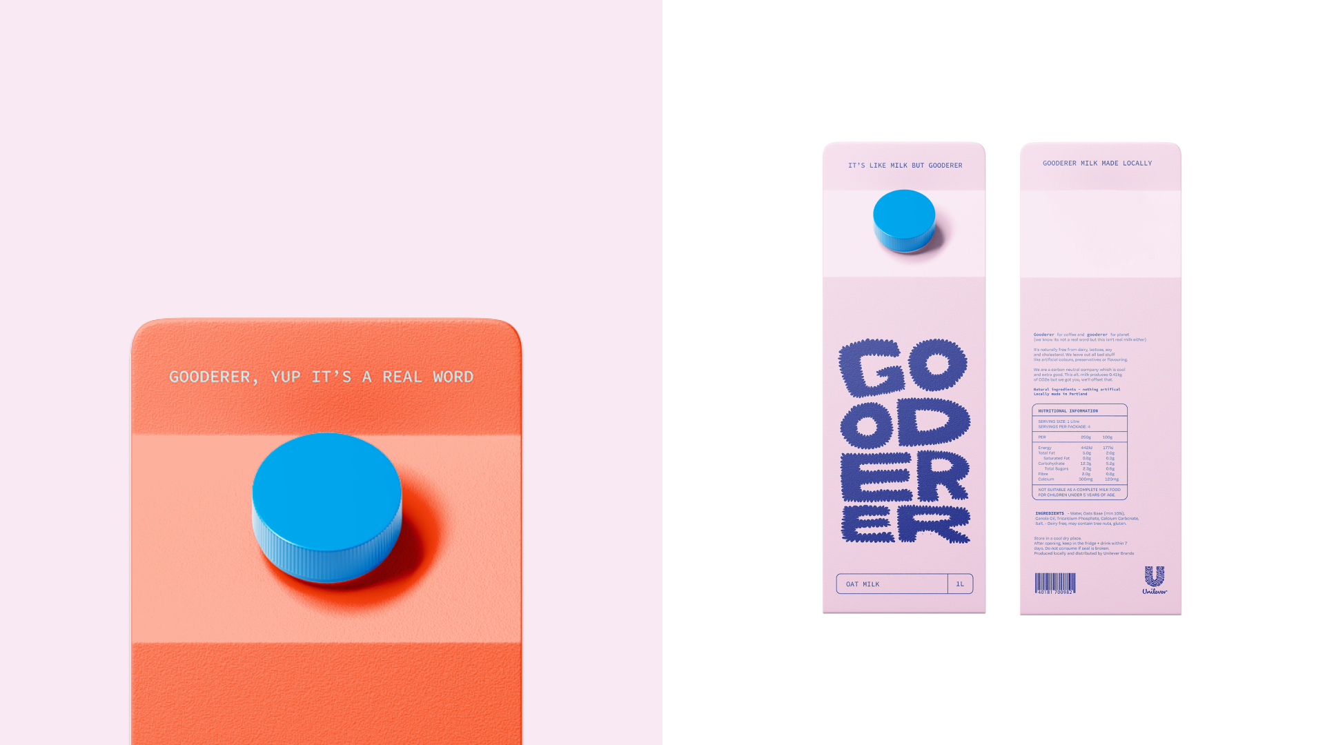 GOODERER is a new disrupter in the milk alternative aisle. The locally made milks are gooderer for planet and gooderer for your tummy. Building from a childlike colour scheme, custom typefaces were created to set this brand apart from the other old school milks.
